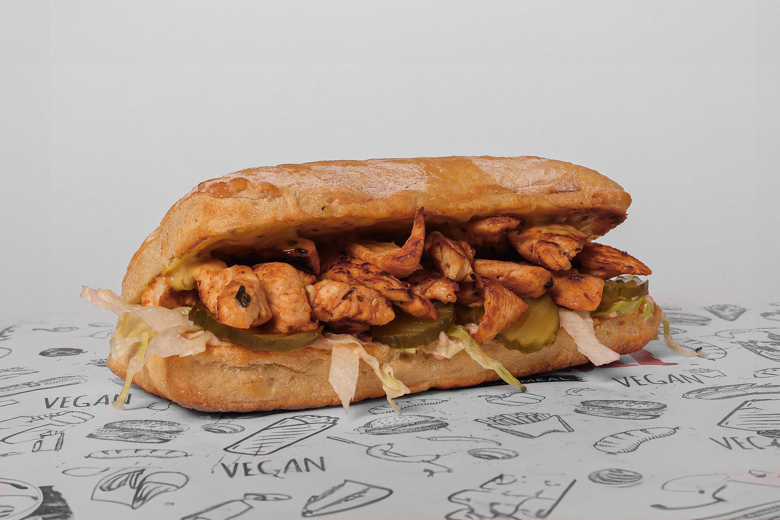 Grilled Chicken Breast, Cheddar Sauce, Iceberg Lettuce, Dill Pickles, Honey Mustard & Barbecue Mayo Sauce